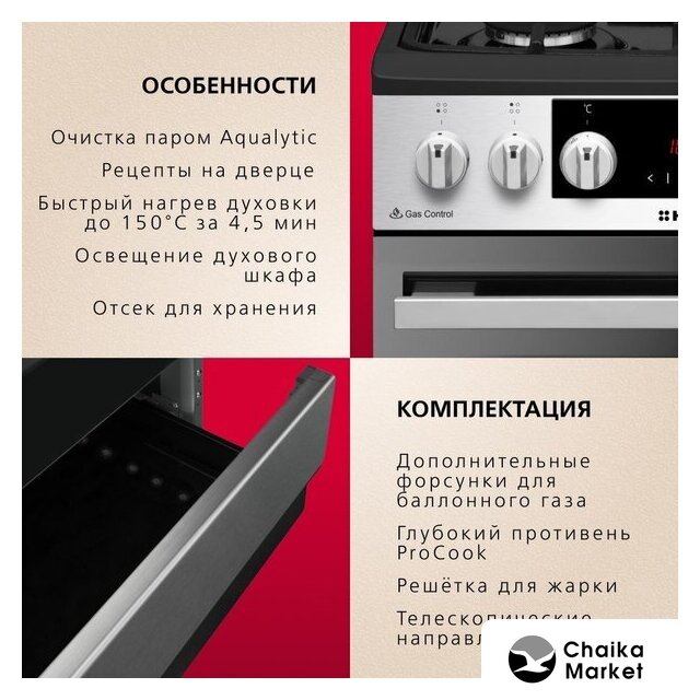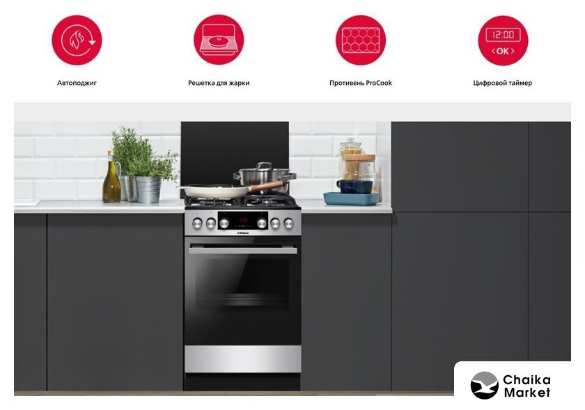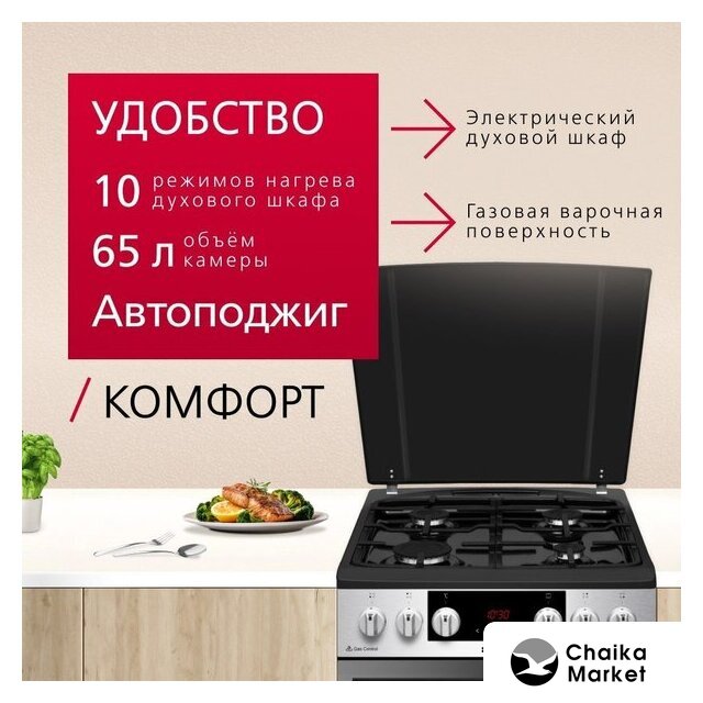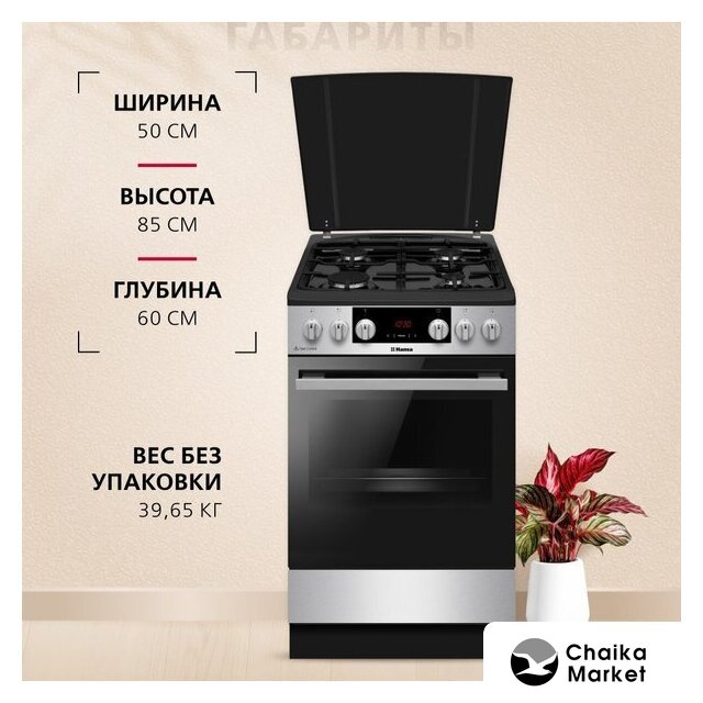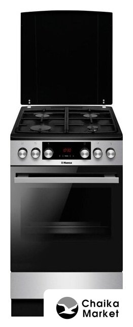 газовая панель + электрический духовой шкаф, газ-контроль конфорок, поверхность: нержавеющая сталь, крышка из закалённого стекла, энергопотребление A, управление электронное, таймер электронный, размеры (ШхГхВ): 50x60x85 см, цвет нержавеющая сталь