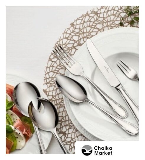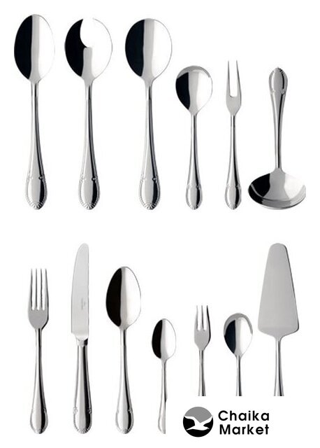 Состав столового набора | вилка столовая, вилка десертная, вилка для салата, вилка для сервировки, ложка столовая, ложка для салата, ложка чайная, ложка соусная, ложка для сахара, ложка для сервировки, нож столовый, лопатка для торта |