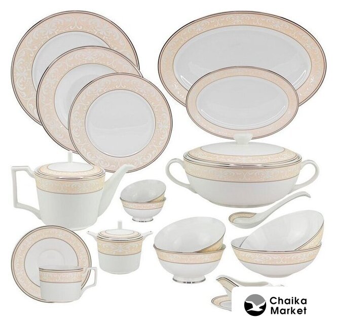 | Состав набора посуды | блюдо, блюдце, глубокая тарелка, десертная тарелка, крышка, ложка, обеденная тарелка, салатник большой, салатник маленький, сахарница, соусница, супница, чайная чашка, чайник заварочный |