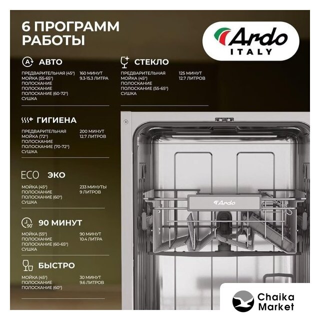 | Дополнительные опции | дополнительная сушка, усиление интенсивности мойки (гигиеническая мойка), половинная загрузка (экономия воды) |