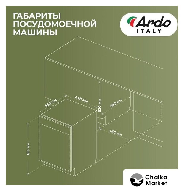 загрузка на 10 комплектов посуды, электронное управление, 8 программ, 44.8×55×82 см, черный цвет, сушка: активная конденсация, половинная загрузка, индикация на полу: луч