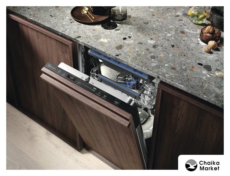 загрузка на 10 комплектов посуды, сенсорное управление, 8 программ, 44.8x55x82 см, черный цвет, сушка: стандартная (конденсация), индикация на полу: луч