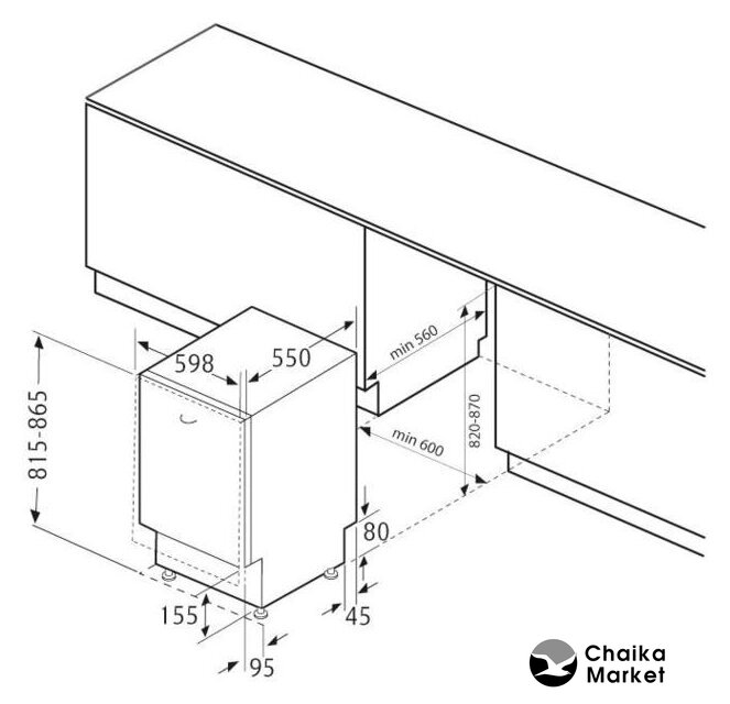 загрузка на 10 комплектов посуды, электронное управление, 9 программ, 44.8x55x82 см, черный цвет, сушка: стандартная (конденсация)/с открыванием дверцы, индикация на полу: проекция дисплея