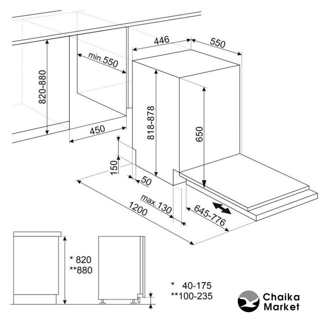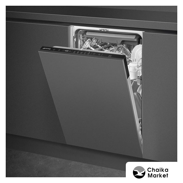 загрузка на 9 комплектов посуды, сенсорное управление, 7 программ, 44.6x55x82 см, черный цвет, сушка: с открыванием дверцы, индикация на полу: луч