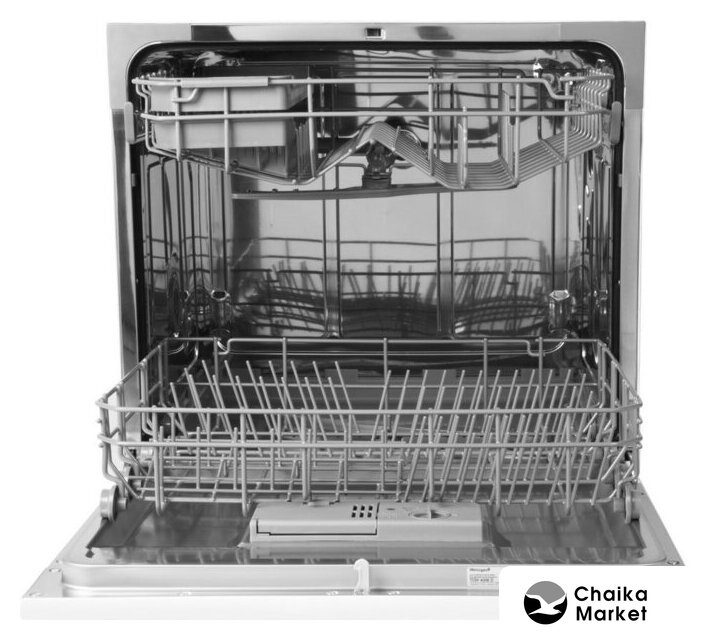 загрузка на 6 комплектов посуды, электронное управление, 5 программ, серебристый цвет, сушка: конденсационная, индикация на полу: нет