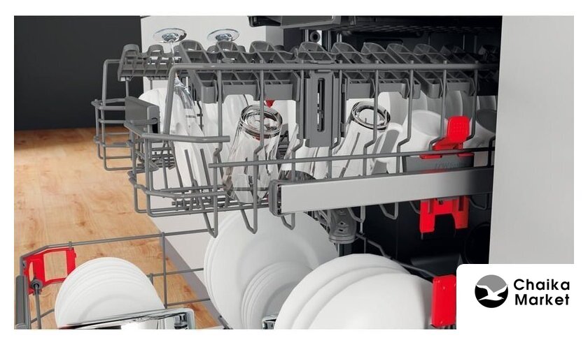 Особенности верхней корзины | регулировка положения по высоте, держатели для бокалов |