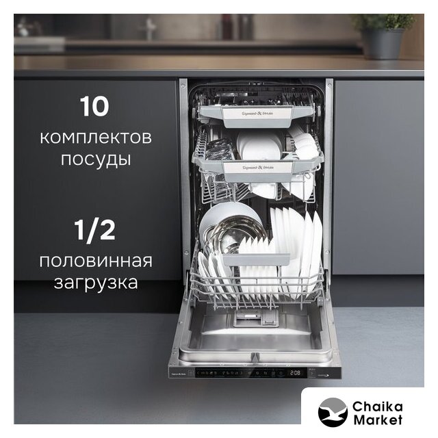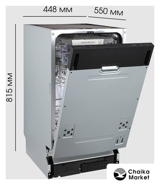 загрузка на 10 комплектов посуды, электронное управление, 8 программ, 44.8x55x82 см, нержавеющая сталь/черный цвет, сушка: стандартная (конденсация)/с открыванием дверцы, индикация на полу: луч