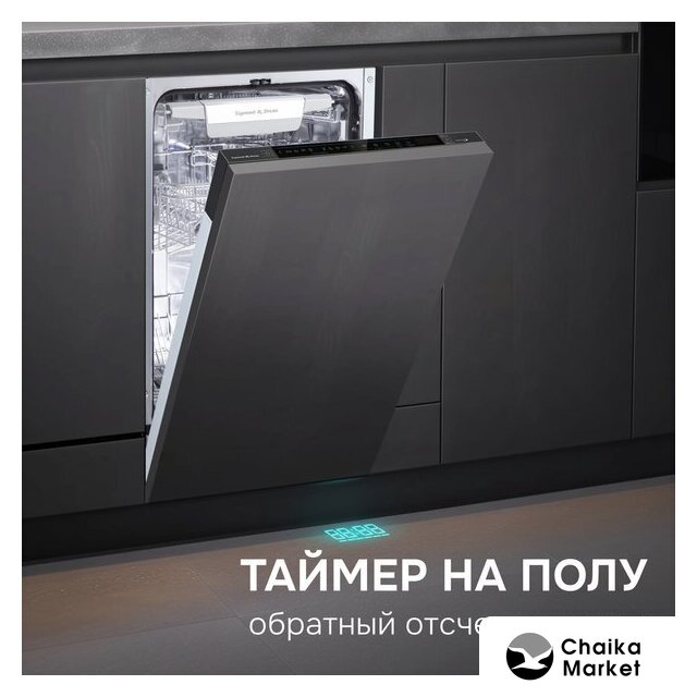 загрузка на 14 комплектов посуды, сенсорное управление, 7 программ, 59.6x55x82 см, черный цвет, сушка: с открыванием дверцы, индикация на полу: луч