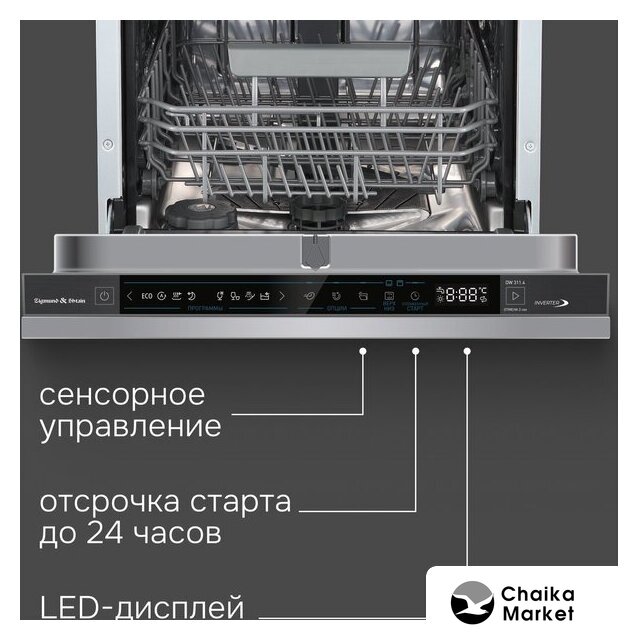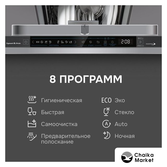 Дополнительные опции | сокращение времени мойки, дополнительная сушка, усиление интенсивности мойки (гигиеническая мойка), половинная загрузка (экономия воды), программа самоочистки |