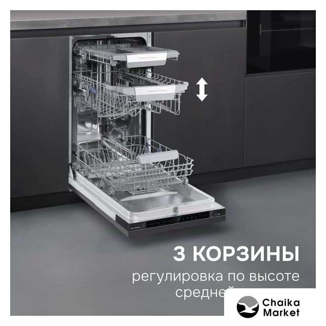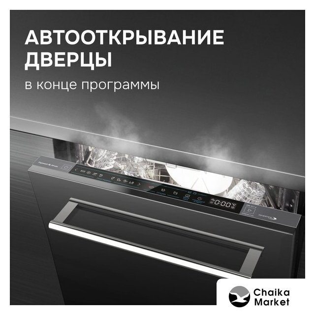 загрузка на 10 комплектов посуды, сенсорное управление, 8 программ, 44.6x55x82 см, черный цвет, сушка: с открыванием дверцы, индикация на полу: луч