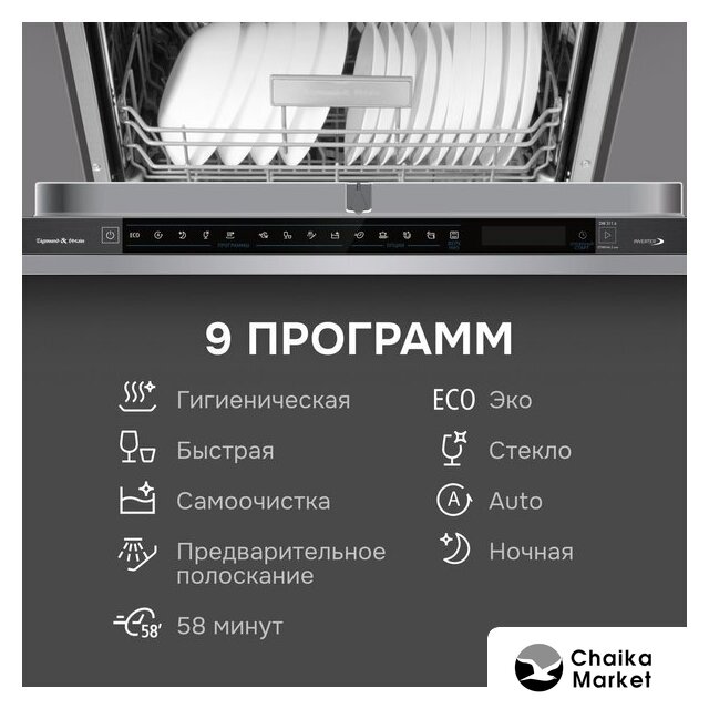 Дополнительные опции | сокращение времени мойки, дополнительная сушка, усиление интенсивности мойки (гигиеническая мойка), половинная загрузка (экономия воды), программа самоочистки |