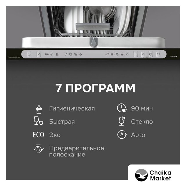 Дополнительные опции | сокращение времени мойки, дополнительная сушка, усиление интенсивности мойки (гигиеническая мойка), половинная загрузка (экономия воды) |