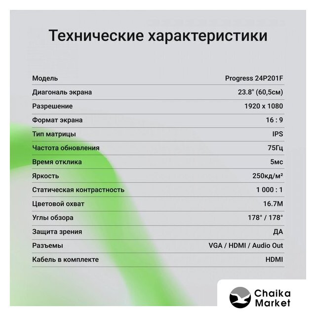 23.8", 16:9, 1920x1080, IPS, 100 Гц, AMD FreeSync, интерфейсы HDMI+D-Sub (VGA)
