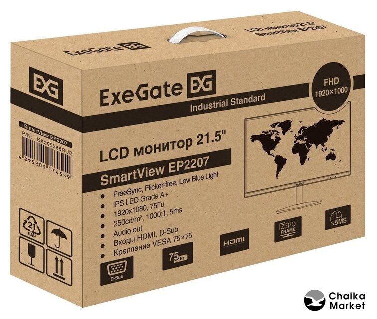 21.5", 16:9, 1920x1080, VA, 75 Гц, AMD FreeSync, динамики, интерфейсы HDMI+D-Sub (VGA)