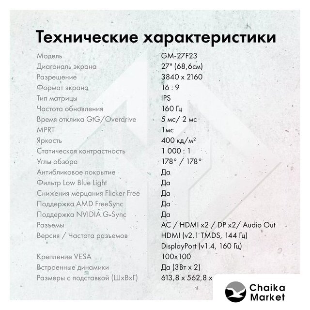 27", 16:9, 2560x1440, IPS, 260 Гц, AMD FreeSync Premium/совместимый с NVIDIA G-Sync, динамики, интерфейсы HDMI+DisplayPort, регулировка высоты, портретный режим