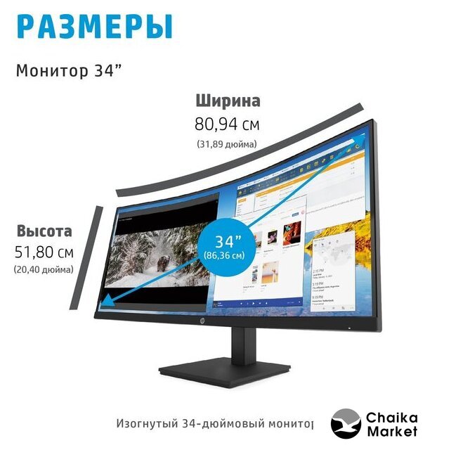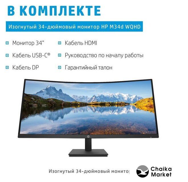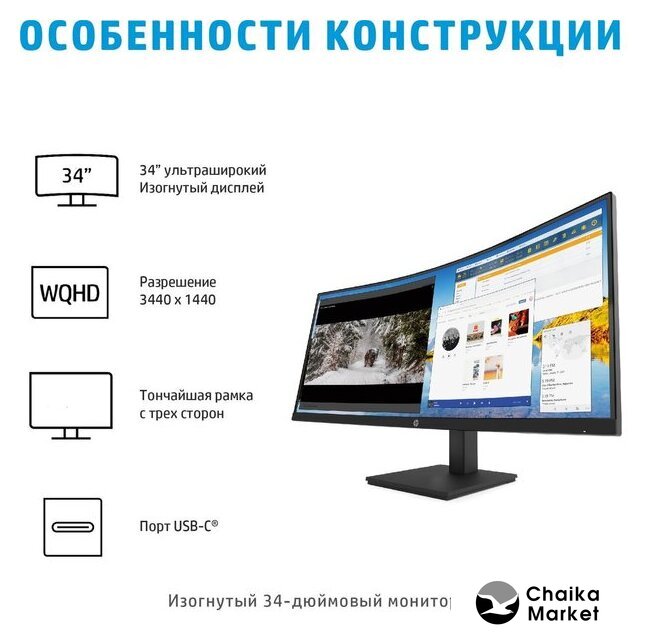 34", 21:9, 3440x1440, VA, изогнутый (1800R), 100 Гц, AMD FreeSync, интерфейсы HDMI+USB Type-C, регулировка высоты