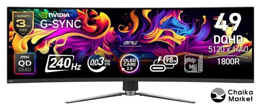 49", 32:9, 5120x1440, OLED, изогнутый (1000R), 240 Гц, AMD FreeSync Premium Pro, интерфейсы HDMI+DisplayPort+micro HDMI, регулировка высоты