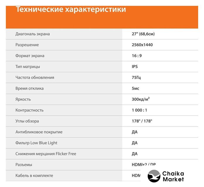 27", 16:9, 1920x1080, IPS, 100 Гц, интерфейсы HDMI+D-Sub (VGA)
