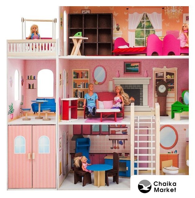 Комплектация | - Кукольный дом- 31 предмет мебели и аксессуаров:Стиральная машинка (дверца открывается), унитаз (крышка поднимается) и раковина в бело-бежевой гамме в ванной комнате. Мойка, плита, стол и 2 стула на кухне, основной цвет - голубой. На веранде круглый голубой стол и 2 табурета. Красный диван, журнальный столик и комод в гостиной. 2 розовые кровати, коричневая тумба под телевизор и большой телевизор в спальне. Коричневый шкаф, гладильная доска и утюг, а также темно-коричневые напольные часы в гардеробной зоне. Белые люлька, пуф и торшер в детской, а также игрушки – кукольный домик, лошадка-качалка, кошка и собака.- Фурнитура для сборки и заглушки для фурнитуры в цвет фасадов- Инструкция по сборке- Гарантийный сертификат. |