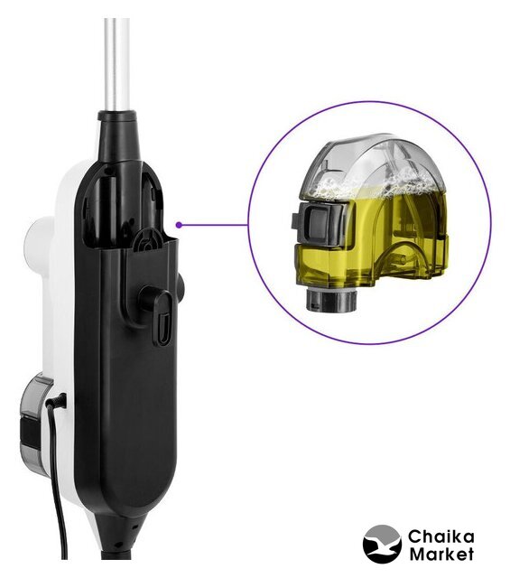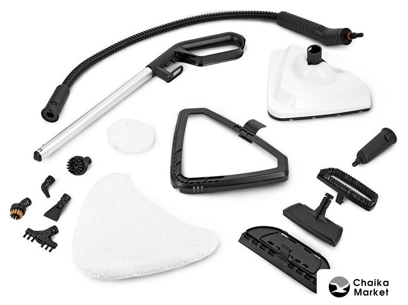 Комплектация | - паровая швабра;- удлинительная ручка;- корпус;- ручной модуль;- резервуар для моющего средства;- крышка резервуара для моющего средства с уплотнительным кольцом;- резервуар для воды;- фильтр для смягчения воды с уплотнительным кольцом;- щетка для пола;- тряпка для пола;- рамка для ковра;- паровой шланг с уплотнительным кольцом;- струйная насадка с уплотнительным кольцом;- насадка для отпаривания;- скребок для стекла с резиновой вставкой;- ворсовая щетка;- угловая насадка;- скребок;- круглая нейлоновая щетка;- плоская нейлоновая щетка;- руководство по эксплуатации. |