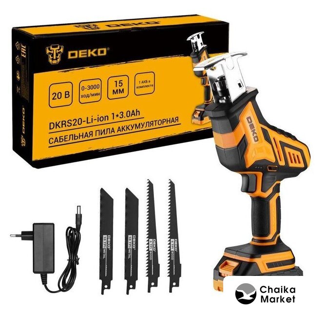 Комплектация | - Сабельная пила - 1 шт.- Аккумулятор 3,0 Ач - 1 шт.- Зарядное устройство - 1 шт.- Пильное полотно - 4 шт.- Руководство по эксплуатации- Коробка |