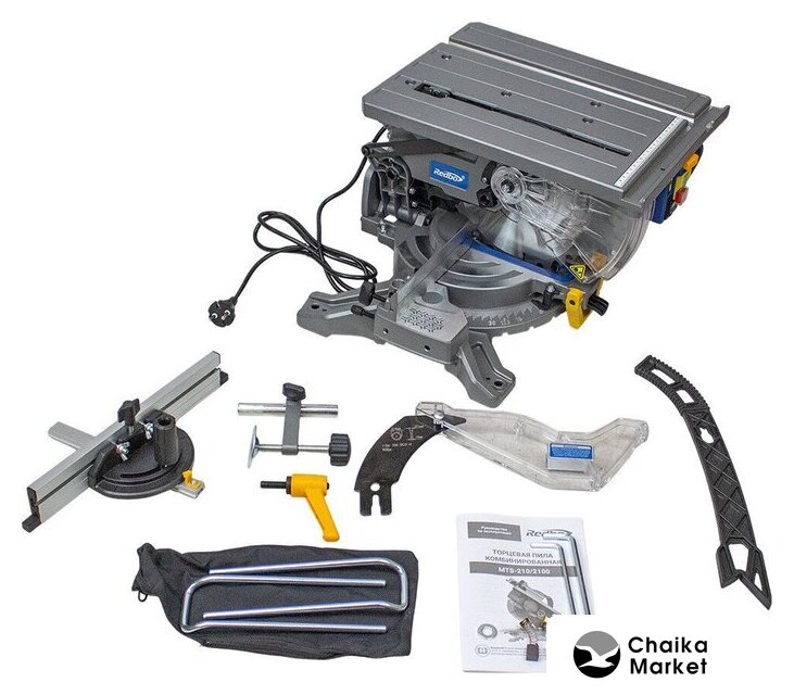 Комплектация | Пила торцеваяДиск пильный (по дереву)Нож расклинивающийКожух защитный верхнийПланка направляющая с транспортиромВертикальный зажим (струбцина)Ключ шестигранный крепления дискаПылесборник/Дополнительные опоры/Толкатель - 1/2/1Руководство по эксплуатацииУпаковка |