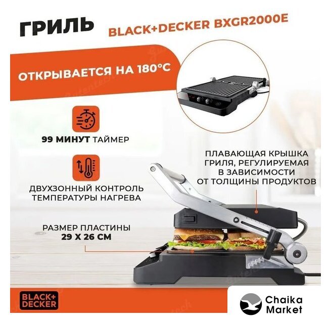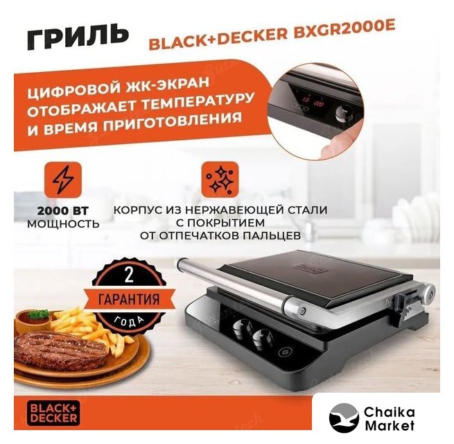 2000 Вт, универсальный, двухсторонний (гриль-пресс), габариты 365x460 мм, рабочая поверхность 370x230 мм