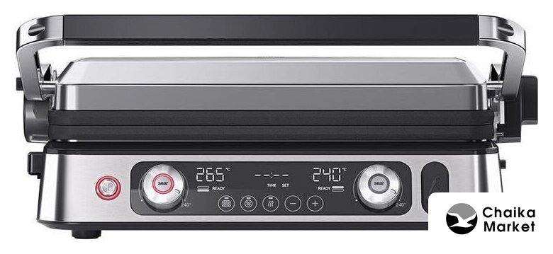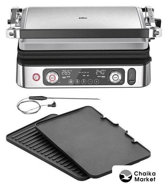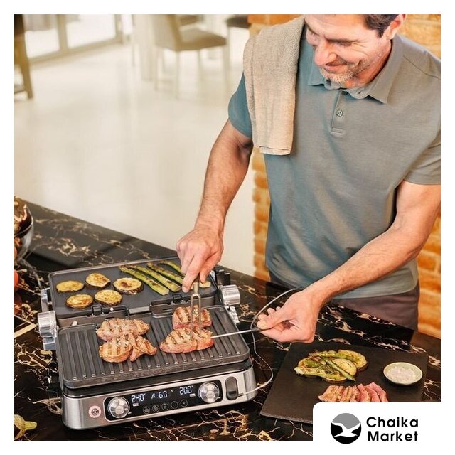 Комплектация | Электрогриль со съемными нагревательными пластинами: гладкая и ребристая, термометр |