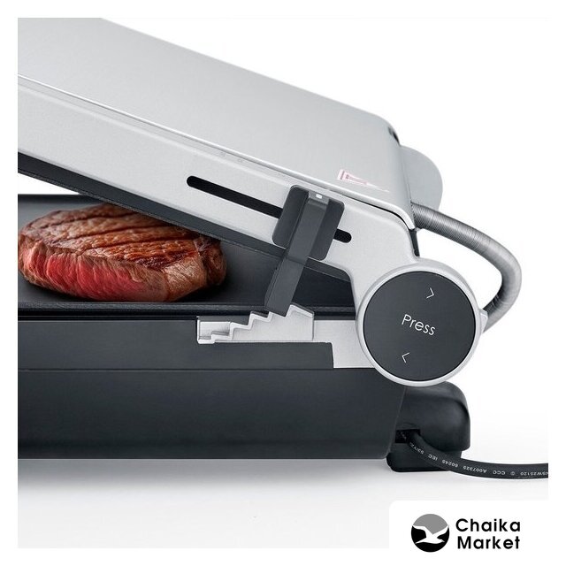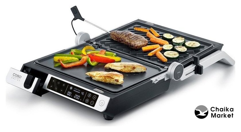 Комплектация | выносной термометр-щуп; съёмные гладкая и рифленая пластины; лоток для сбора жира; инструкция |