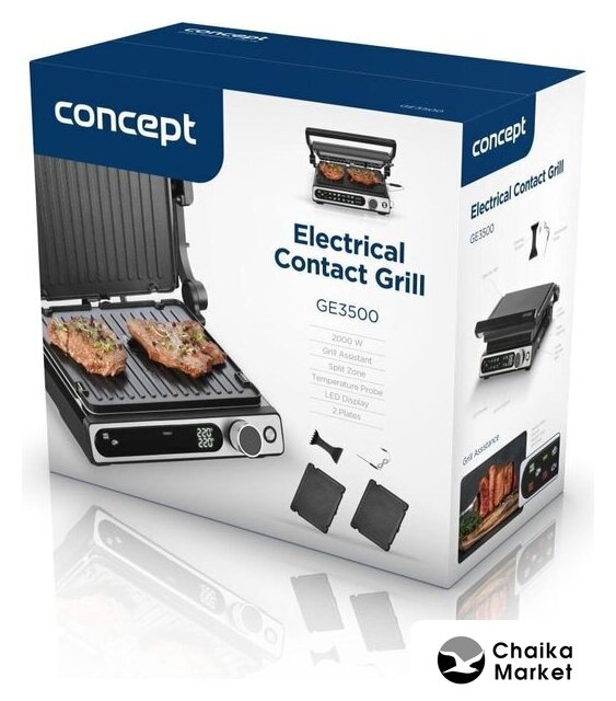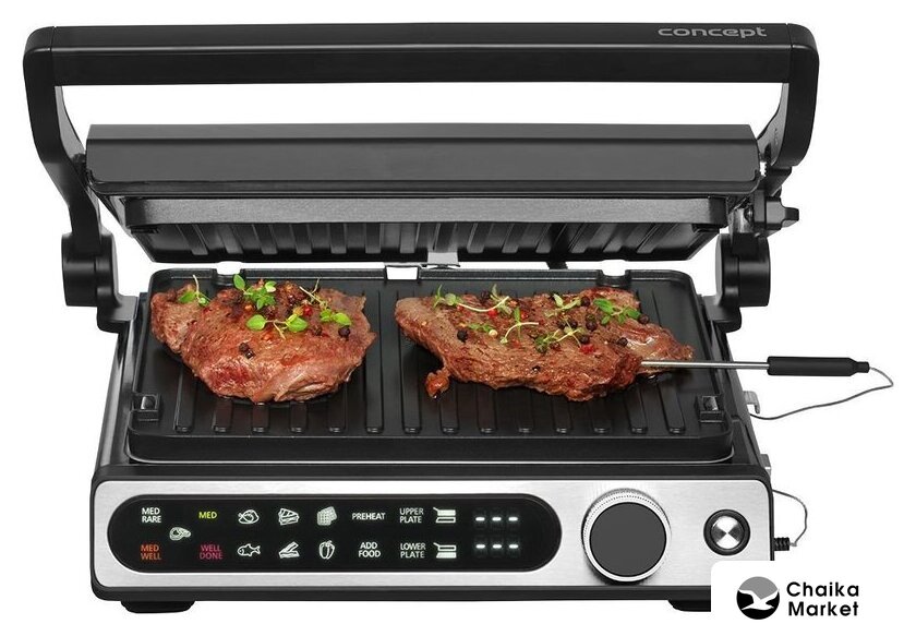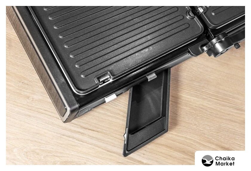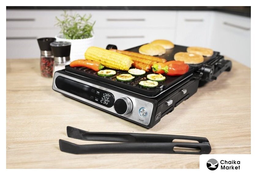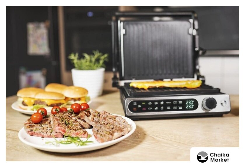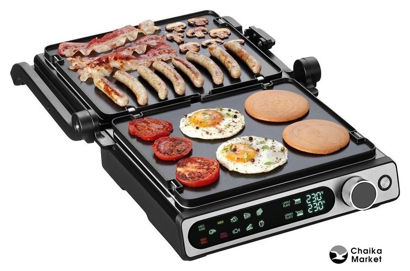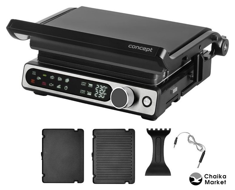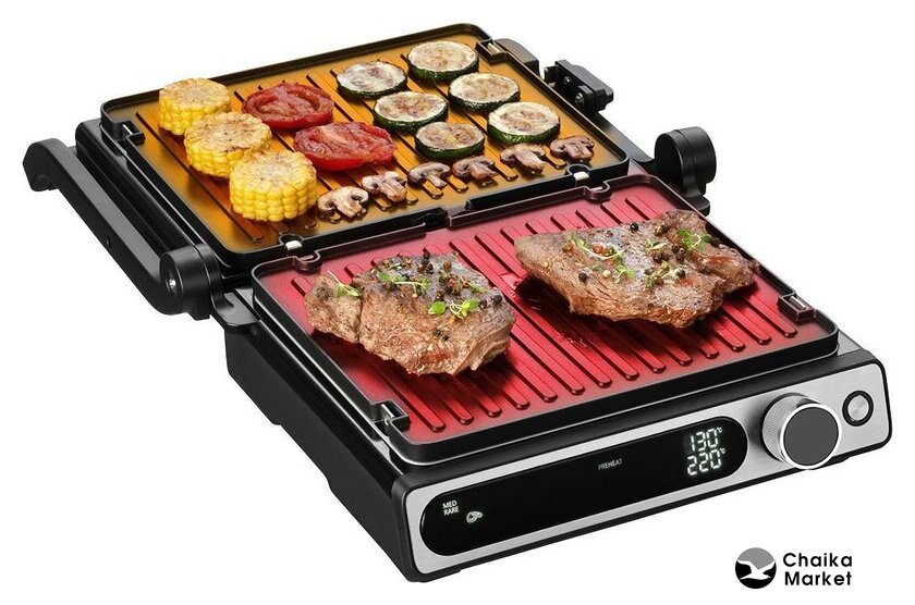 Комплектация | Электрогриль со съемными нагревательными пластинами: гладкая и ребристая, термометр, скребок |