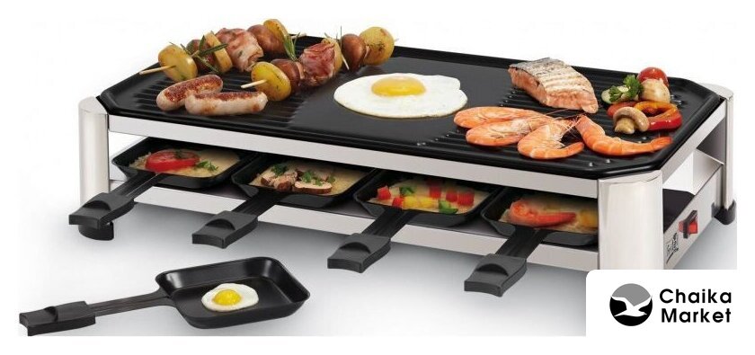 | Комплектация | раклетница, 8 небольших противней, 8 лопаточек для перемешивания. |