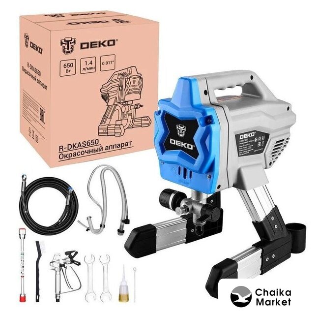 Комплект поставки | - Окрасочный аппарат – 1 шт- Окрасочный пистолет – 1 шт- Шланг для подачи краски под давлением – 1 шт- Заборный шланг – 1 шт- Удлинитель (30 см) – 1 шт- Гаечный ключ – 2 шт- Щетка – 1 шт- Стакан для краски– 1 шт- Масленка – 1 шт- Игла для прочистки сопла – 1 шт- Руководство по эксплуатации – 1 шт |