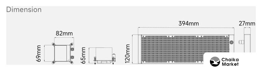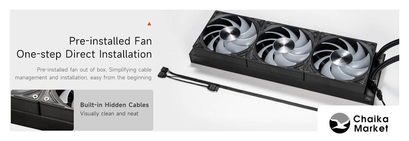 типоразмер 360 мм, рассеивание до 300 Вт, высота 27 мм, макс. шум 32.87 дБ, вентилятор 120 мм, 2000 об/мин, PWM