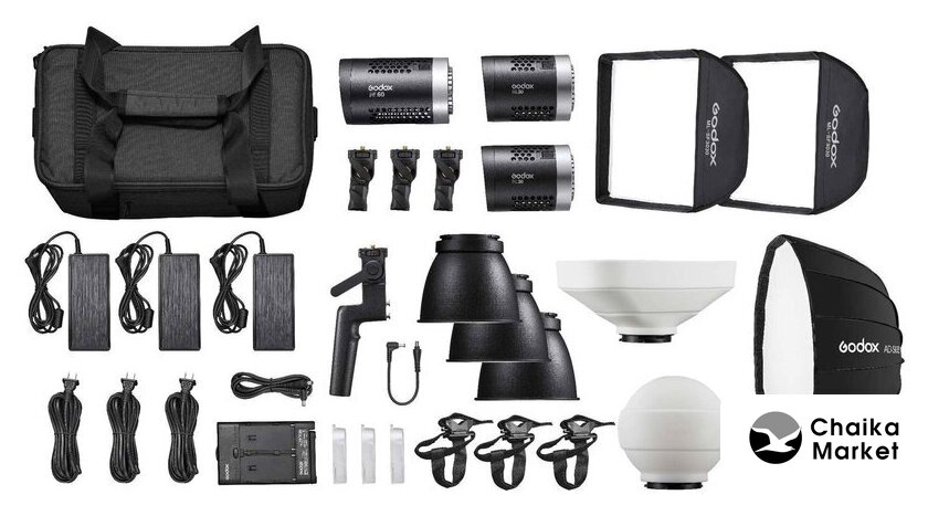 | Комплектация | - Осветитель светодиодный Godox ML30 – 2 шт- Осветитель светодиодный Godox ML60 – 1 шт- Сетевой адаптер – 3 шт- Кабель питания AC 5 м– 3 шт- Держатель сетевого адаптера – 3 шт- Аккумуляторная площадка Godox BC60 – 1 шт- Кабель питания DC 1.5 м – 1 шт- Кабель питания DC 0.2 м – 1 шт- Рефлектор RTF – 3 шт- Рассеиватель сферический Godox ML-CD15 – 1 шт- Рассеиватель Godox ML-CS1625 – 1 шт- Софтбокс Godox AD-S65S быстроскладной – 1 шт- Софтбокс Godox ML-SF3030 – 2 шт- Адаптер на стойку Godox ML-TA1– 3 шт- Рукоятка Godox Adapter Holder – 1 шт- Кейс для хранения Godox CB33 – 1 шт- Руководство по эксплуатации и гарантийный талон |