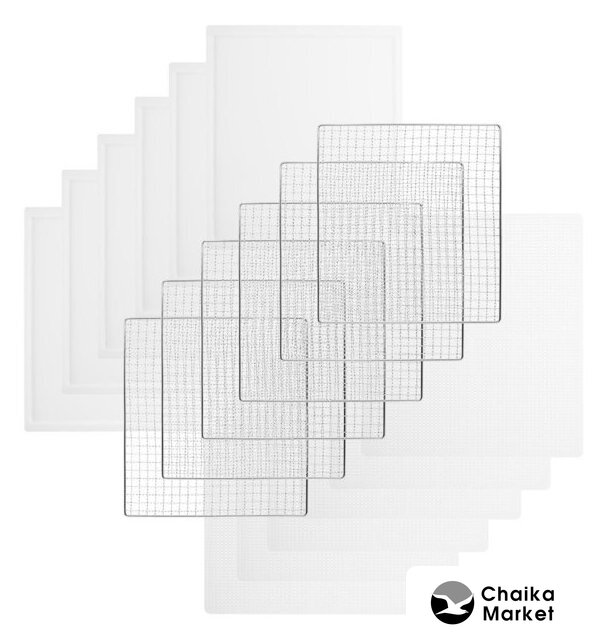 Комплектация | - 6 поддонов для сушки;- 6 поддонов для жидкости;- 6 сеток для трав, ягод и т.д;- 1 корзина. |
