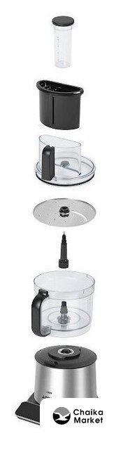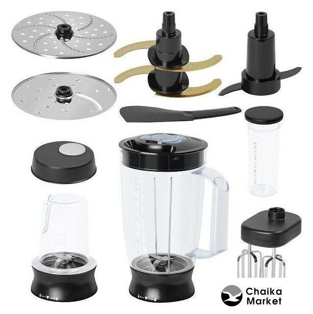 | Полная комплектация | чаша измельчителя 3.5 л; большой толкатель; малый толкатель / мерный стакан 120 мл; нож для измельчения; насадка для замешивания теста; диск для мелкого натирания и тонкой нарезки; диск для драников; венчик; кофемолка 80 г; мерный стаканчик 60 мл; чаша блендера 1.5 л; лопатка |