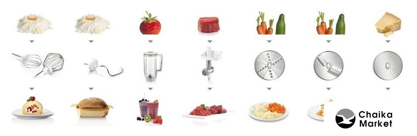Функции | мясорубка, блендер, взбивание, смешивание, замешивание дрожжевого теста, терка, шинковка, ломтерезка |