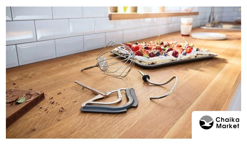 | Полная комплектация | насадка для смешивания с силиконовым покрытием, насадка для взбивания, крюк для замешивания, 4 сменных диска из нержавеющей стали (6 функций): реверсивный диск для нарезки ломтиками (крупная и мелкая), реверсивный диск для нарезки ломтиками (крупная и мелкая), диск для мелкой терки и диск для нарезки картофеля драниками, чаша блендера 1.25л, Cube Cutter: насадка для нарезки овощей, фруктов и мяса ровными кубиками, формирователь печенья, пластиковая чаша, прозрачная крышка чаши для защиты от брызг, мясорубка, кейс для хранения оборудования |
