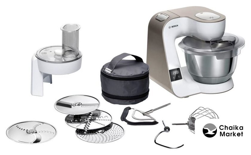 1000 Вт, планетарное смешивание, объем чаши: 3.9 л, терки, мясорубка, соковыжималка, блендер