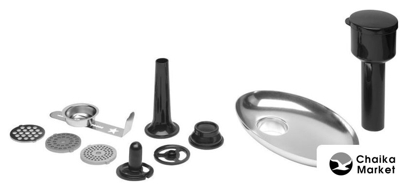 | Полная комплектация | Миска из нержавеющей стали 5 л с ручкой + крышкойВенчикГибкий наконечникМешалкаКрючок для замешиванияМясорубка (3 сменных диска с разной толщиной помола) + аксессуары для фарширования колбас + аксессуары для приготовления печеньяТерка с 5 сменными насадками. |