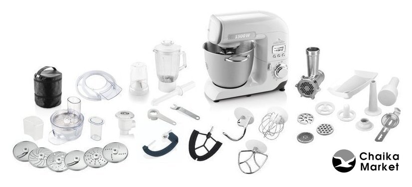 1500 Вт, планетарное смешивание, объем чаши: 5.5 л, терки, измельчитель, мясорубка, блендер