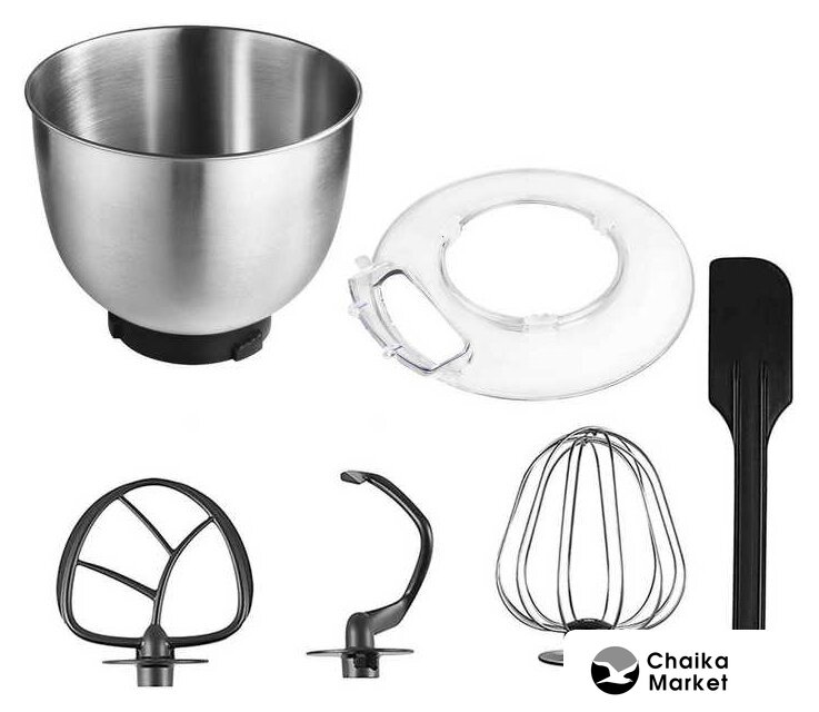 | Полная комплектация | Чаша 5 лВенчикНасадка для тестаНасадка для смешиванияЛопаткаКрышка от брызг |