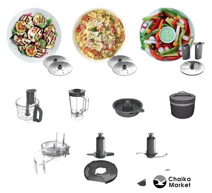 1000 Вт, планетарное смешивание, объем чаши: 4.3 л, терки, измельчитель, соковыжималка, блендер