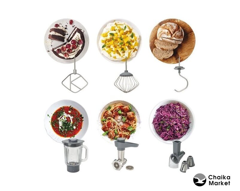 1000 Вт, планетарное смешивание, объем чаши: 4.5 л, терки, измельчитель, мясорубка, блендер