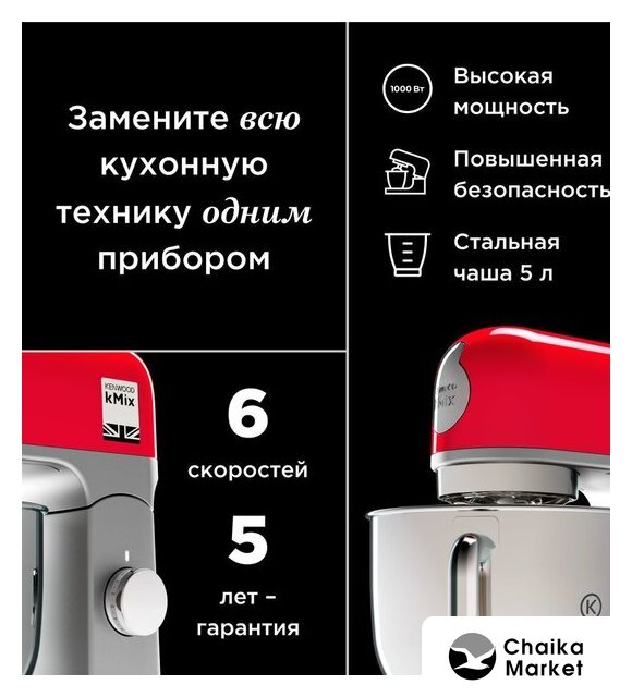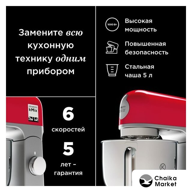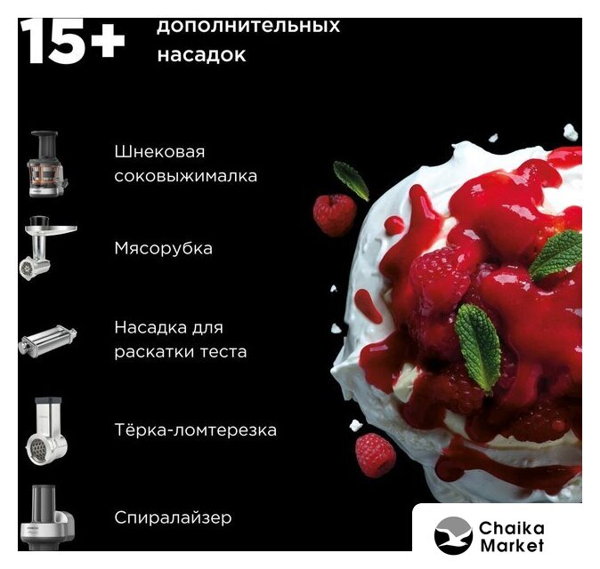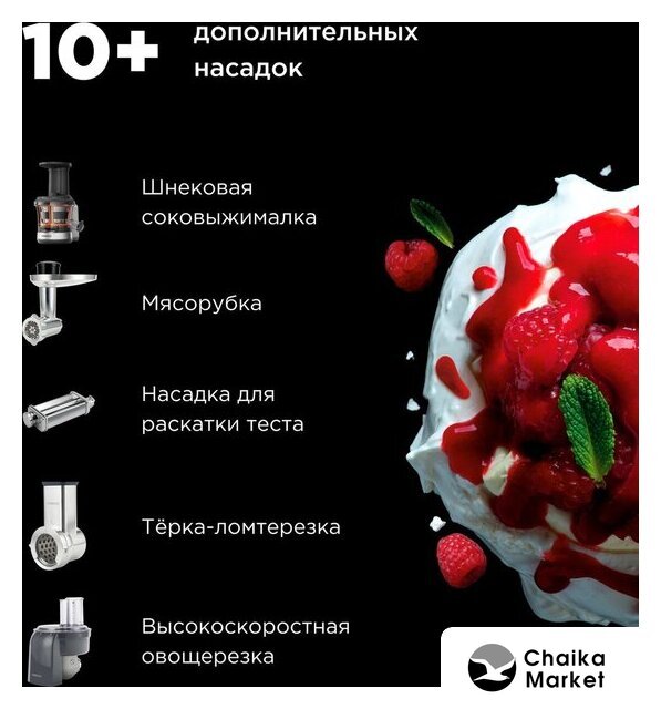 1000 Вт, планетарное смешивание, объем чаши: 4.3 л, терки, измельчитель, соковыжималка, блендер