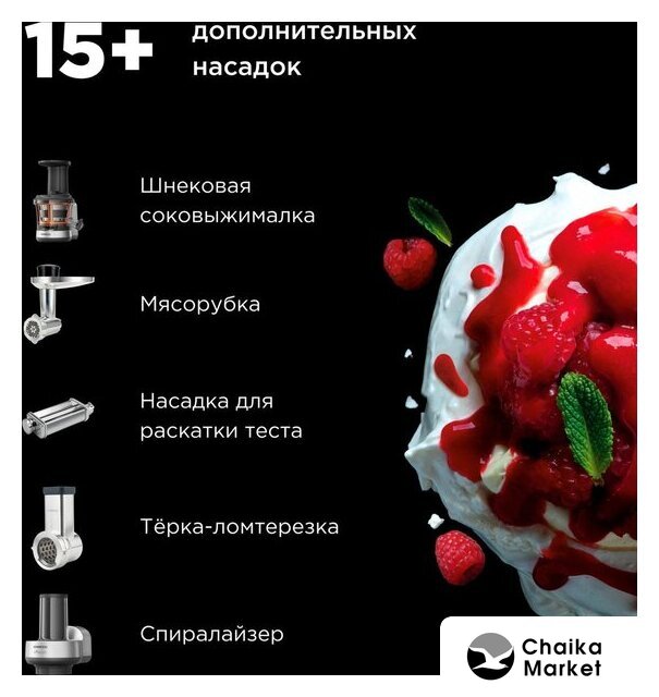 1000 Вт, планетарное смешивание, объем чаши: 4.3 л, терки, измельчитель, соковыжималка, блендер