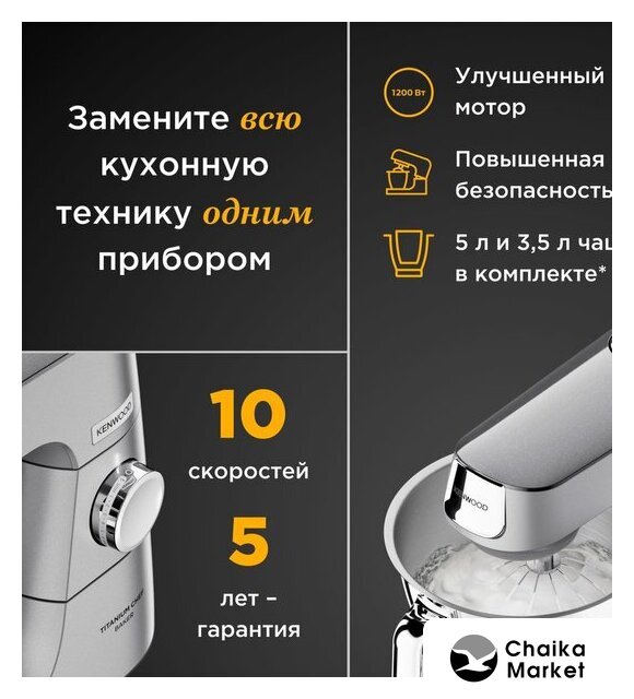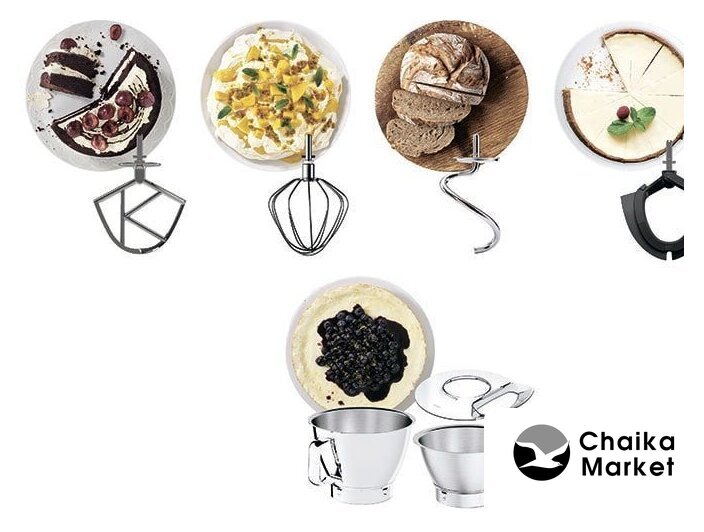 1200 Вт, планетарное смешивание, объем чаши: 5 л, терки, мясорубка, блендер