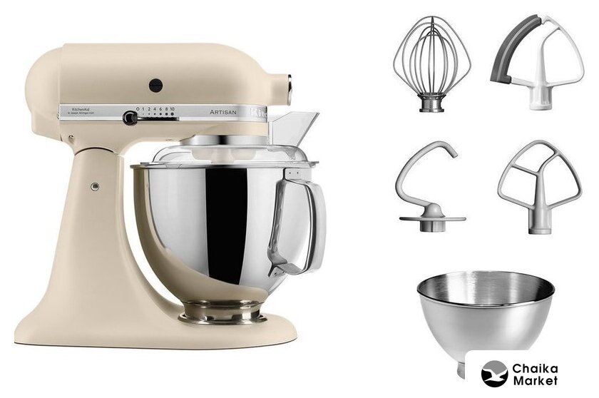 Полная комплектация | стальная чаша объемом 4,8 л;cтальная чаша объемом 3 л;проволочный венчик;крюк для теста;лопатка для смешивания;лопатка с гибким ребром;защитный обод |