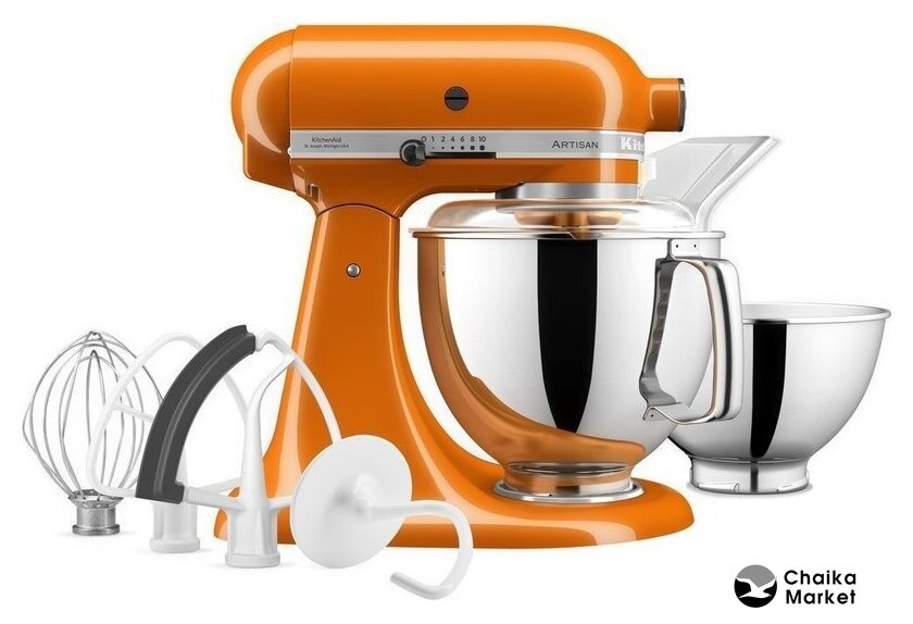 Полная комплектация | Чаша из нержавеющей стали объемом 4,8 лЧаша из нержавеющей стали объемом 3 лПрозрачный защитный ободВенчикКрюк для тестаНасадка для смешивания |