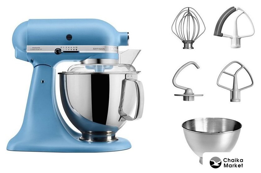 Полная комплектация | стальная чаша объемом 4,8 л;cтальная чаша объемом 3 л;проволочный венчик;крюк для теста;лопатка для смешивания;лопатка с гибким ребром;защитный обод |